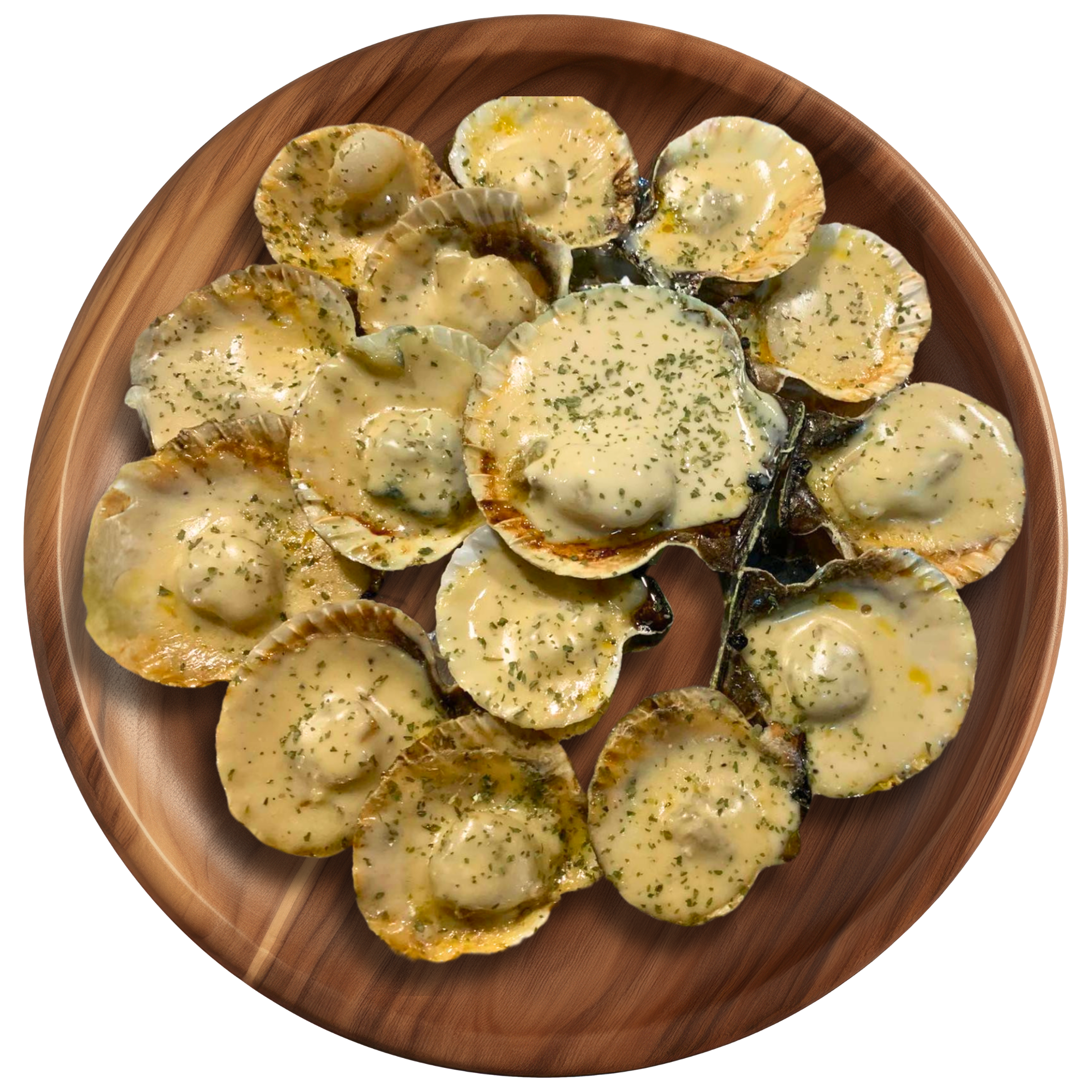 Fresh scallops topped with creamy, melted cheese.